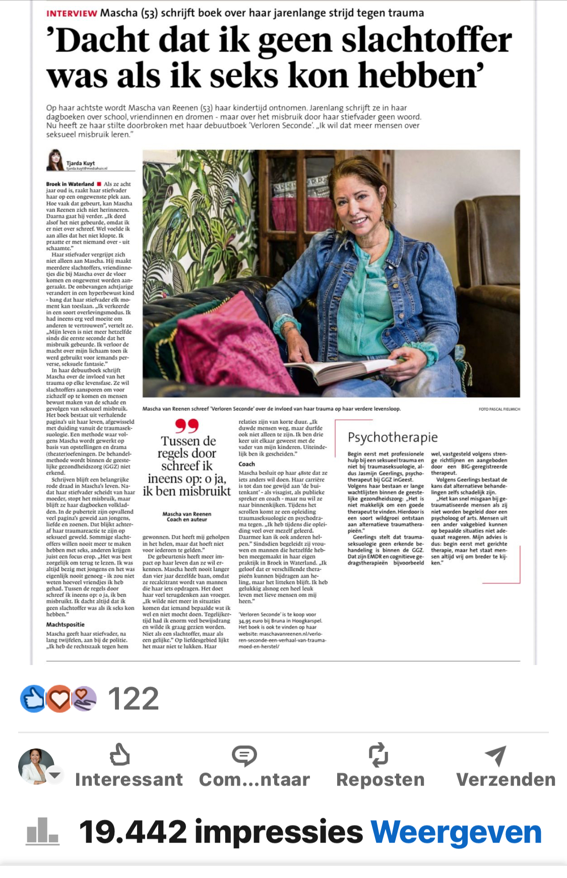 Ik heb gelukkig ook zulke mooie podcasts, artikelen, gesprekken met journalisten gehad die met zoveel respect en liefde omgegaan zijn met mijn boek en mijn verhaal. En als belangrijke note, het wel gelezen hebben. Mijn werk serieus nemen. Ook de GGZ, ook wetenschappers. artsen…noem maar op. Daar ben ik dankbaar voor.